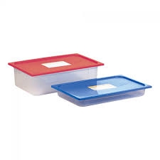transparant polypropyleen, luchtdicht afsluitbaar. Geschikt voor vriezer -40°C en magnetron +95°C (exclusief deksel). Stapelbaar en met maatverdeling. Vaatwasmachine bestendig. Zijn absoluut smaak- en reukvrij. Met blauwe of rode deksel